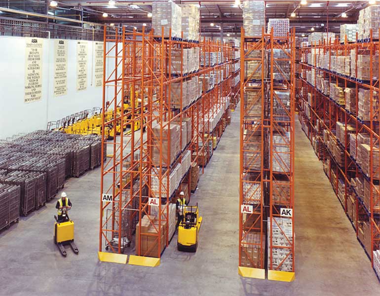The racking systems are all configured around wide aisles, utilising a 2650mm clear entry beam and store two pallets across each bay. Loads can be up to 1, 600mm high and weigh up to 1250kgs. The racking rises to 9.6 metres at its highest point, enough space for 5 beam levels.